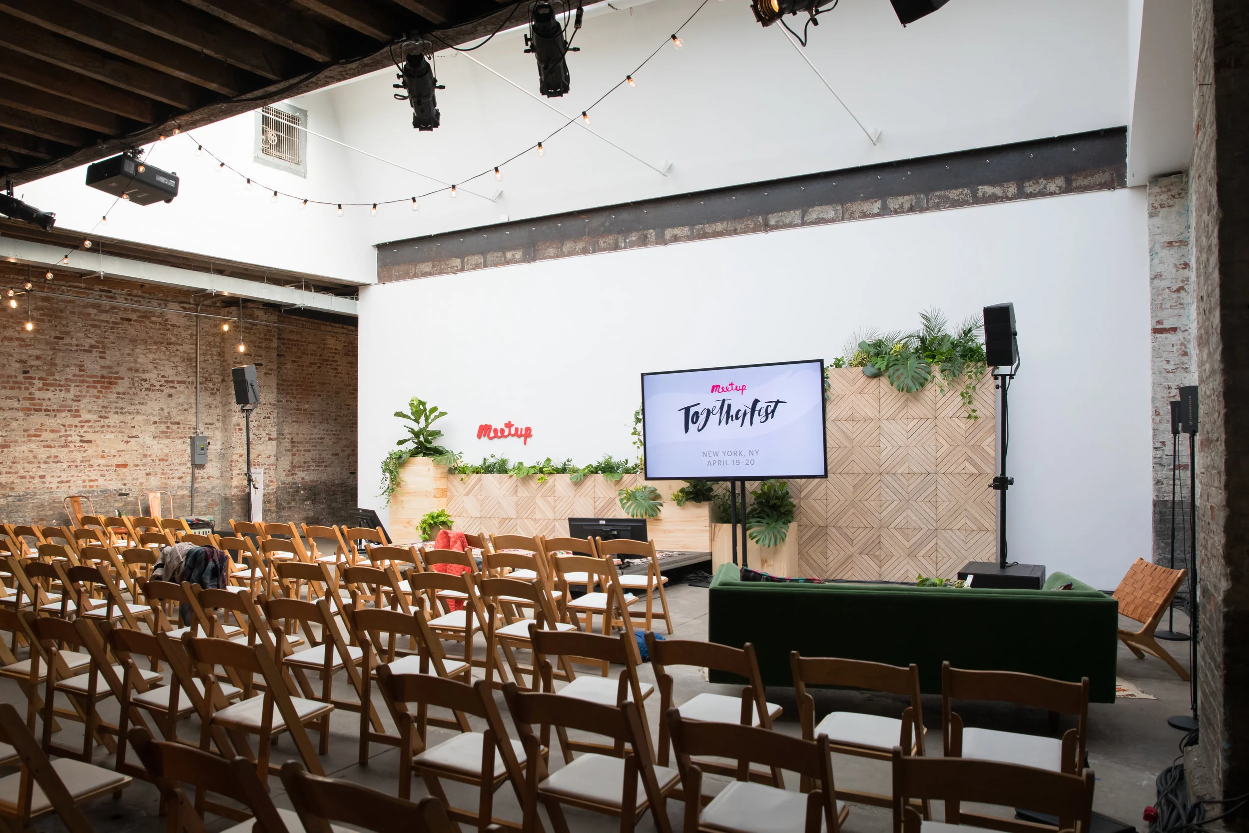 From initial brainstorming sessions down to the final champagne toast, WORKSHOP worked with Meetup to create a one-of-a-kind day for their first ever gathering of organizers. Togetherfest was meant to be a balance of inspiration and practical conversations, fun and learning, listening and talking. After finding a location that could accommodate both large group talks and small group discussions, we set about to design a space that felt warm and intimate while still providing a wow to attendees. Small touches, like everyone having a personalized plant to take home or a live brass band on parade, ensured all the Meetup organizers felt appreciated, honored, and happy. The programing and production ensured that Meetup staff had an opportunity to get feedback on their product and announce new features in a beautiful and functional setting.